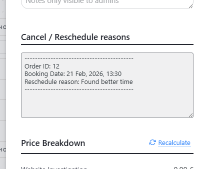Admins and staff can now edit cancellation or reschedule reasons directly inside the booking edit/order modal.
