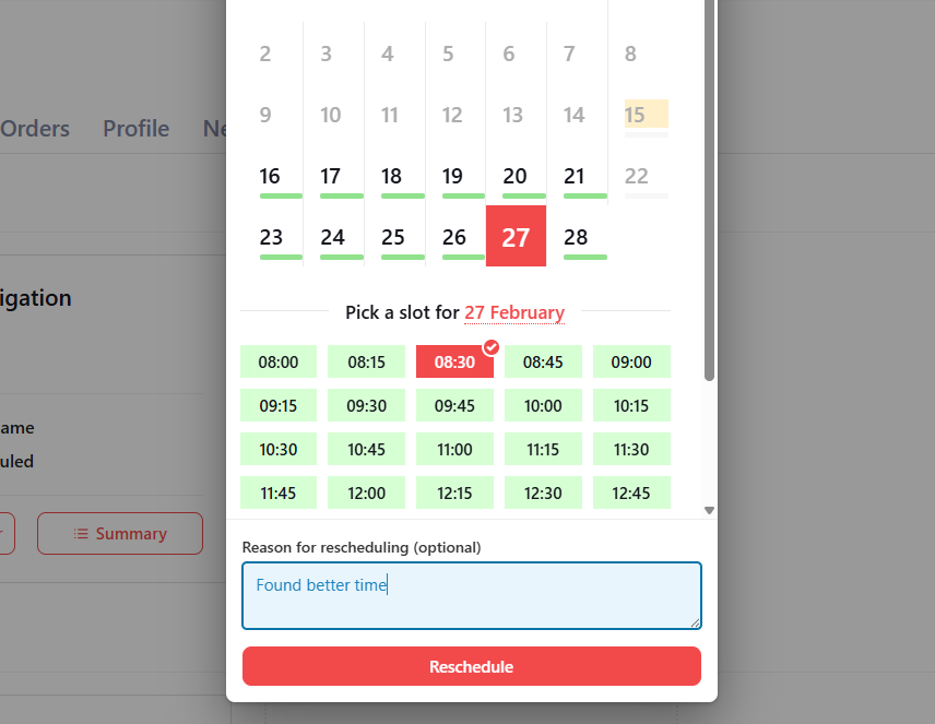 Cancellation and reschedule reasons appear at the top of the booking summary.