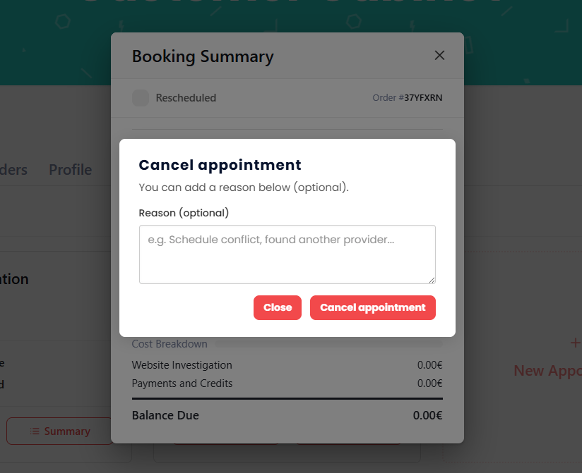 When a customer clicks “Cancel”, a modal appears with an optional reason field.