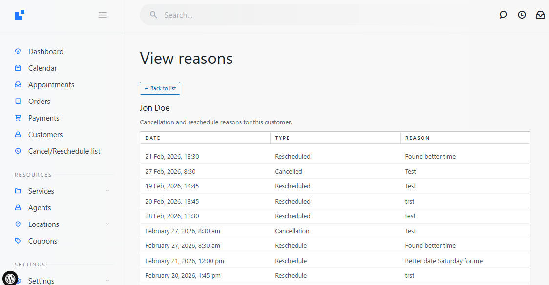Customers can either select a predefined reason from quick suggestions or enter their own custom reason. All reasons are saved per booking and per customer and are visible inside the LatePoint admin.
