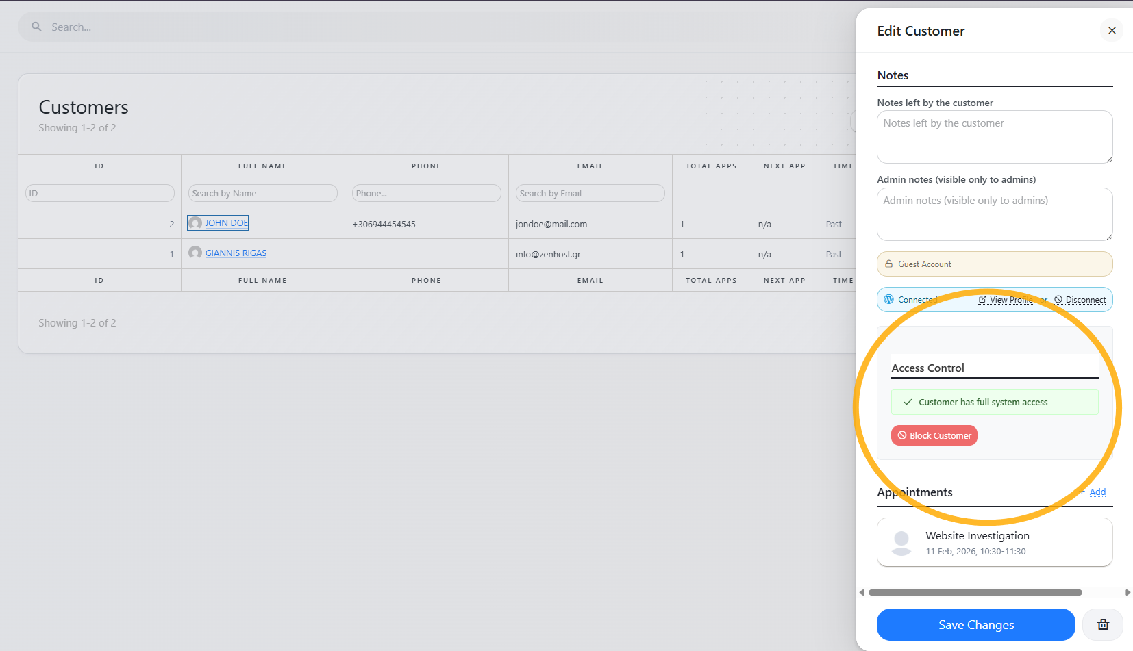 Easily manage customer access from the existing customer edit interface inside LatePoint.