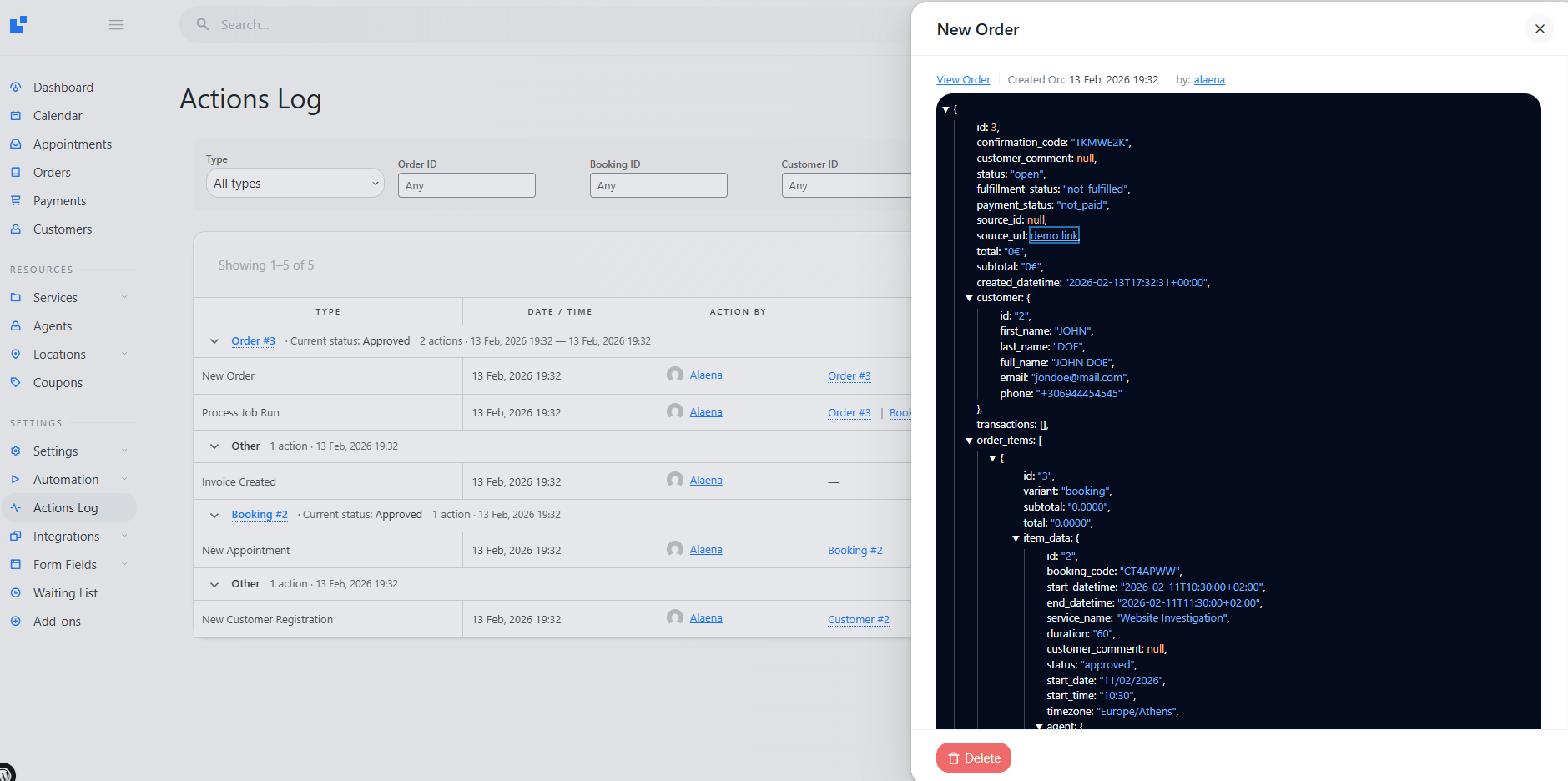 Displays all LatePoint system actions in a single, powerful activity table — so you can investigate exactly what happened and when.